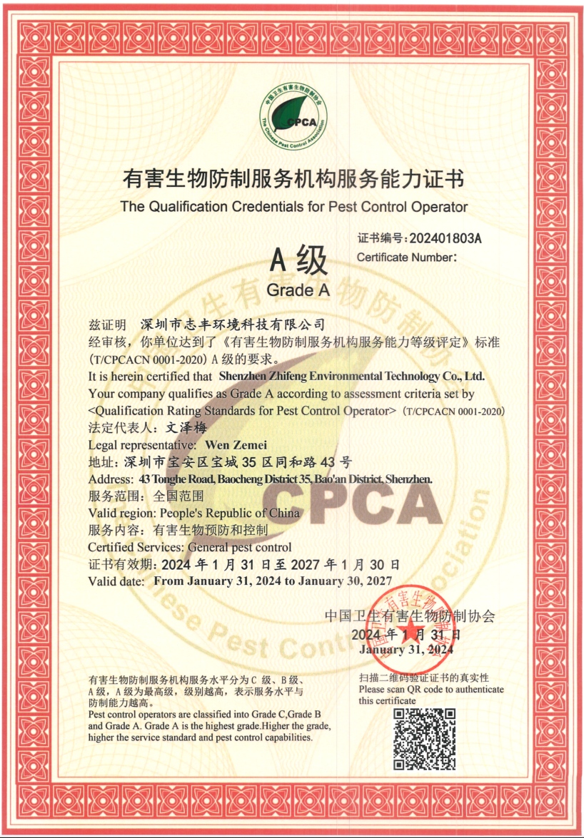 深圳市有害生物防制機構A級服務能力證書